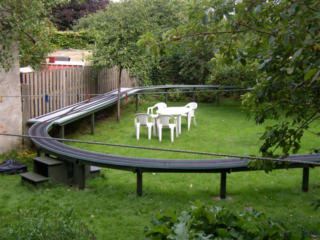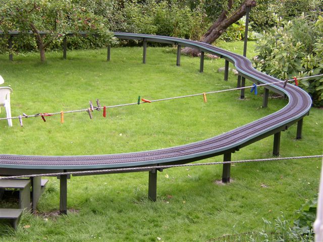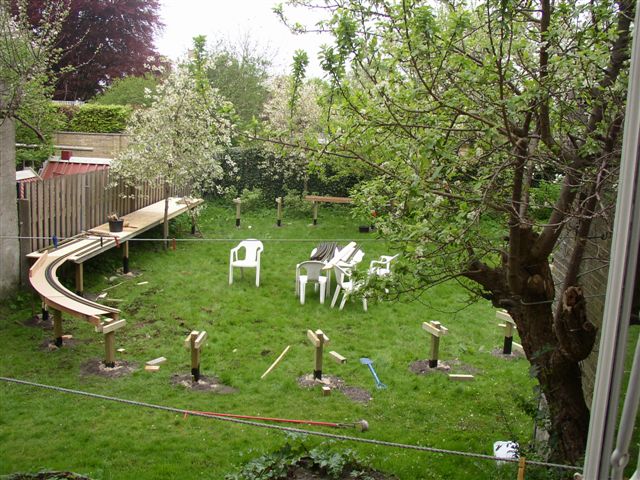 Byggeri 2007Den første bane blev opført i foråret 2007, og bestod af en dobbeltsporet bane på 9 x 12 meter. En omgang var oprindeligt ca. 30 meter, senere er banen blevet ændet, så en omgang nu er omkring 40 meter. Herunder ses en lille fotoserie, som viser opføreslen af banen. Konstruktionen fra start til slut tog ca. 2 måneder, og blev udført i det tidlige forår 2007. Der er mange, som har spurgt hvorfor banen er opført på stolper. Man kunne jo lige så godt have lagt den i "jordhøjde", som man ser det mange andre steder. Grunden er simpel: Den er bygget til at køre med rigtige damp tog (Live steam), og disse kræver at man kan arbejde en del med dem, derfor er det praksis at bygge banerne i en praktisk arbejdshøjde, så man ikke får ondt i ryggen, eller ømme knæ.