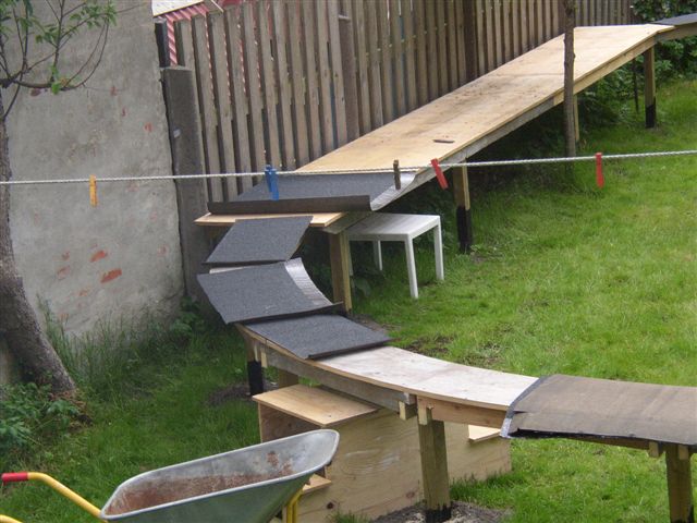 Dækket bestod af 22 mm krydsfiner, af typen man bruger til undertag. Disse kan ikke tåle at være ude, så dækket blev beklædt med alm tagpap. granulatoverfladen ligner "den ægte vare" ret fint,