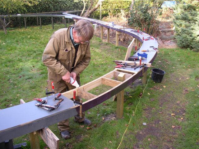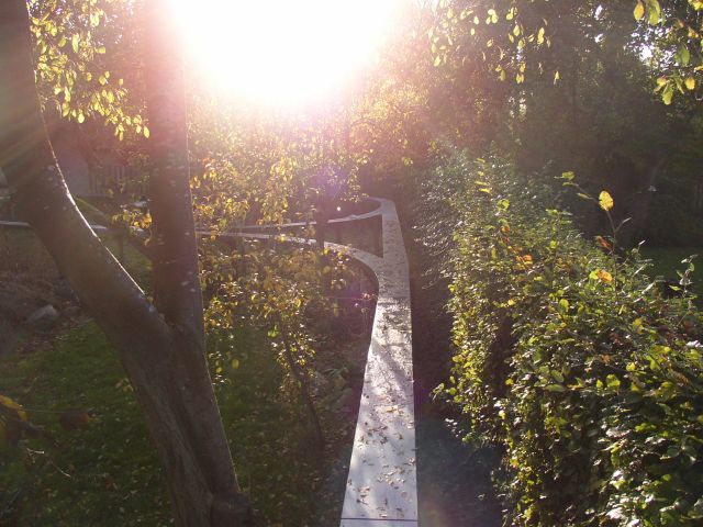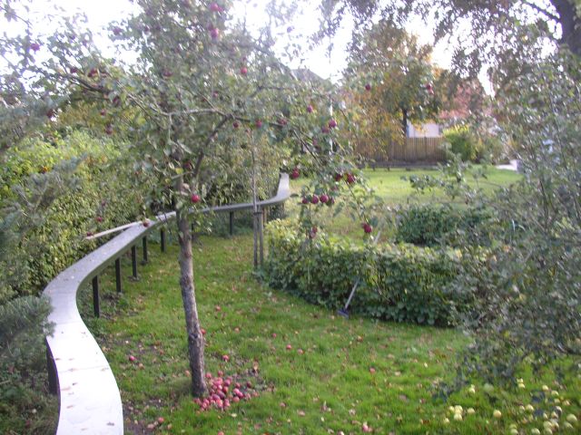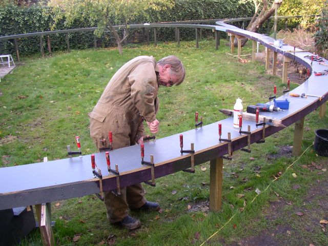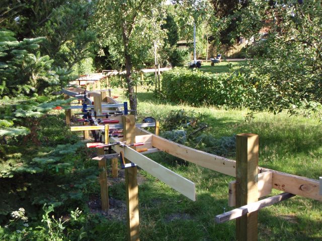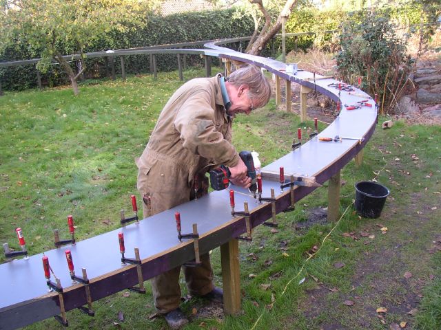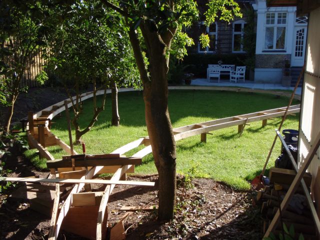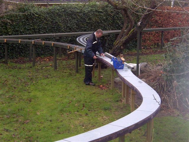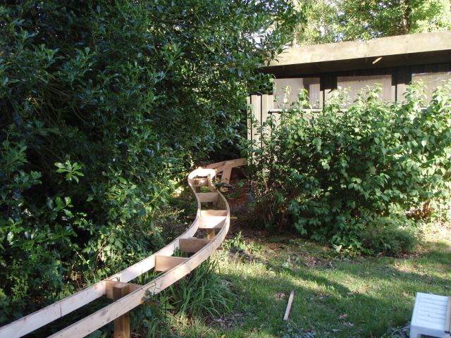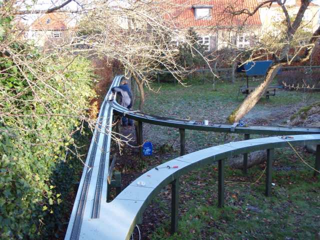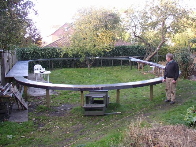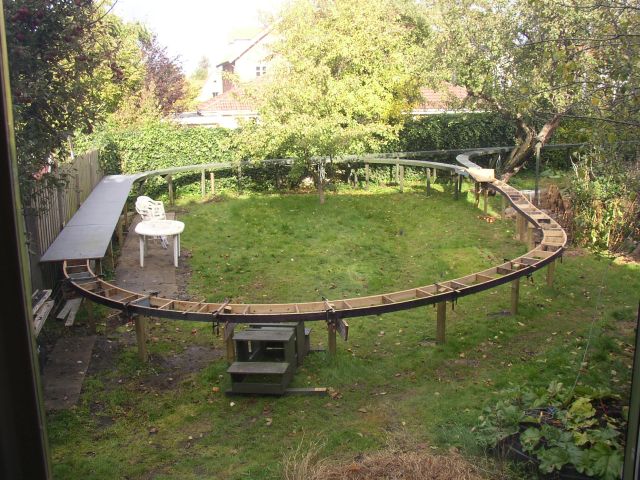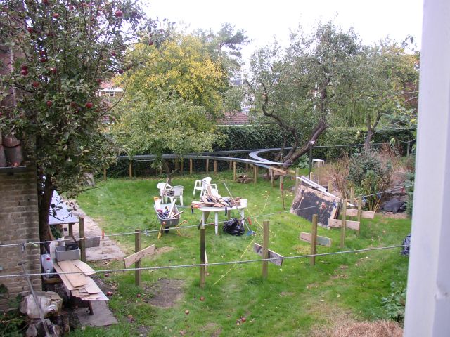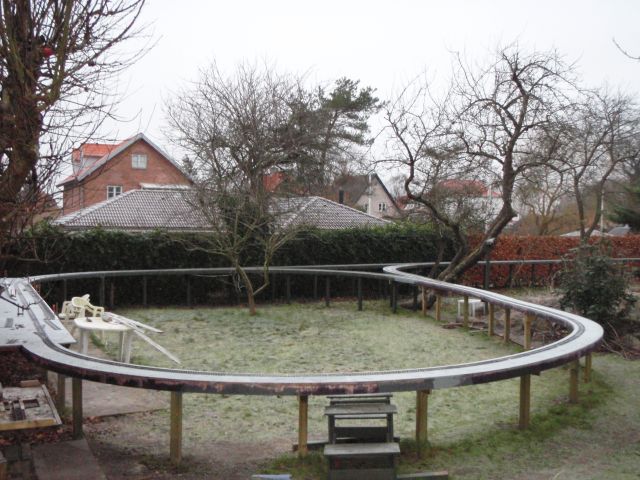 Byggeri 2008-9I løbet af efteråret 2007 begyndte jeg at overveje om banen skulle udvides. Jeg syntes det var lidt for kedeligt bare at se de små damptog kører rundt i en cirkel, og besluttede derfor at inddrage mere af haven. Havebaner kræver dog meget plads, og vi lavede derfor adskillige udkast før det nuværende layout blev godkendt. Det primære problem er, at baner på stolper "lukker af" for adgangen, og man derfor hurtig kan få opdelt sin have på en uheldig måde. På den anden side skal togene ikke gemmes af vejen ude i skel. Det skulle også være muligt at se togene ude i landskabet indimellem. Herudover er det vigtigt at der er en praktisk arbejdshøjde. Hr. Horst Holtmann fra Tyskland overbeviste mig om at en arbejdshøjde på minimum 80cm i cirklen er et must. Damptog kræver at man arbejder med dem, så hvis banen er for lav får man udfordret knæ og ryg. På den anden side må der gerne være variation i banen, så den ikke kommer til at fremstå statisk. Derfor har vi forsøgt at få begge dele med i det endelige layout, altså sektioner i noget der minder om "jordhøjde", og sektioner med "arbejdshøjde" så banen er både fuktionel og skulpturel. Den færdige bane består af ialt ca 330 meter skinner. Den længste strækning er på ca 200 meter, hvilket svarer til 6,4 skalakm for et tog i 1:32. Kompromiset blev understående layout, som jeg er meget tilfreds med.