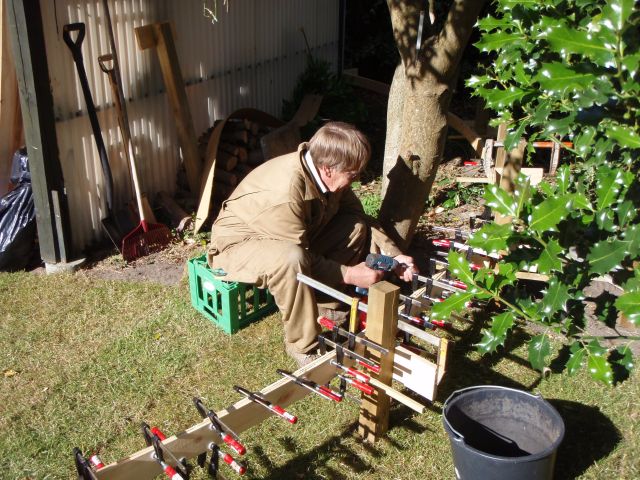 Der limes atter vanger. (vi har ca 70 skruetvinger til at holde sagerne på plads, og de er alle i brug, når der limes)