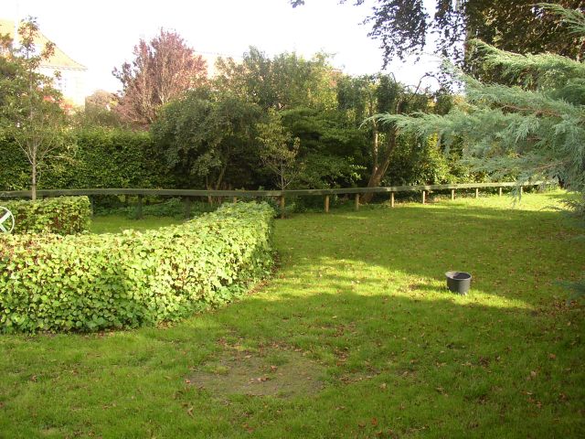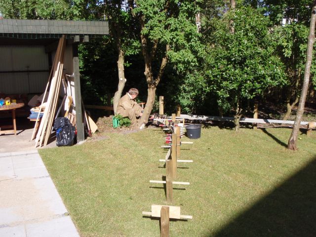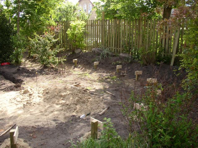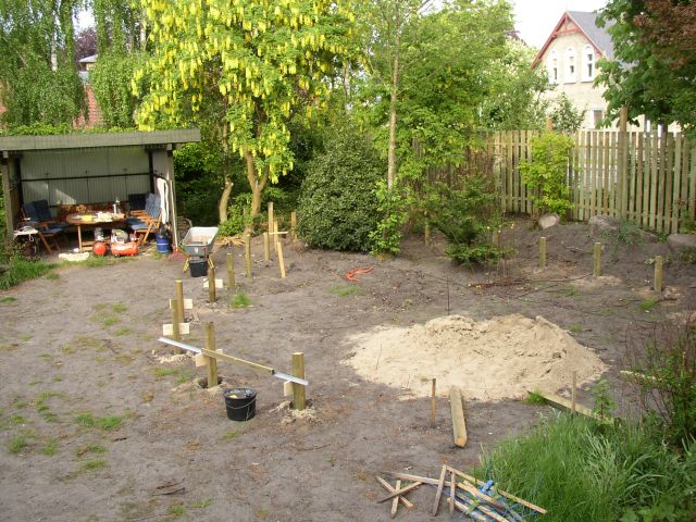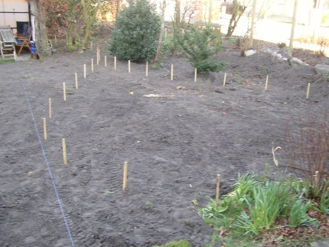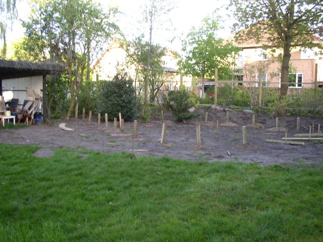 Samme procedure i resten af haven. Her ses stolperne placeret mod øst. Herefter blev der rullet græs ud, lagt fliser og fremstilling af vanger blev påbegyndt. Fremstilling af vanger