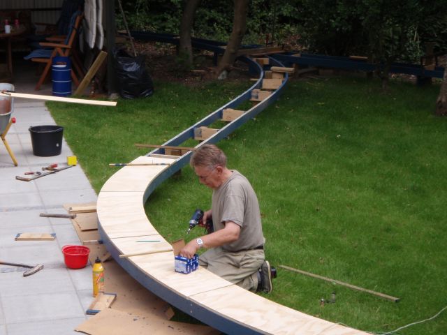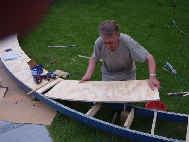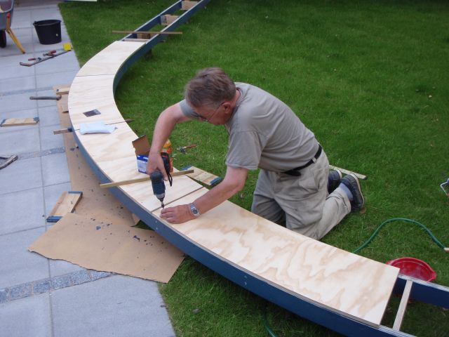 Dækket skæres til i sektioner af 120 cm 19mm krydsfiner, og skruelimes derefter fast i vanger og mellemstykker. Den blå faver er grundmaling.