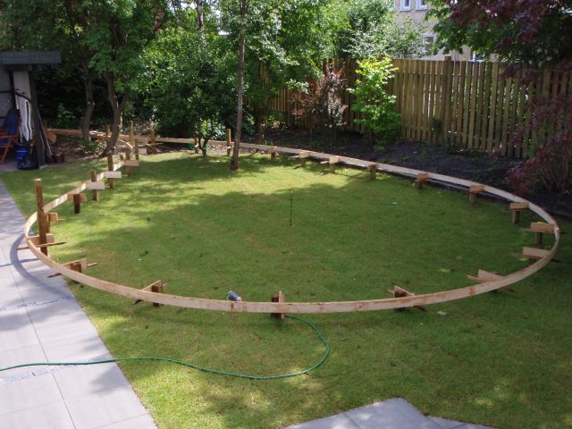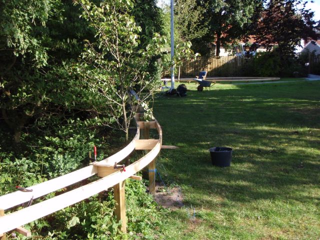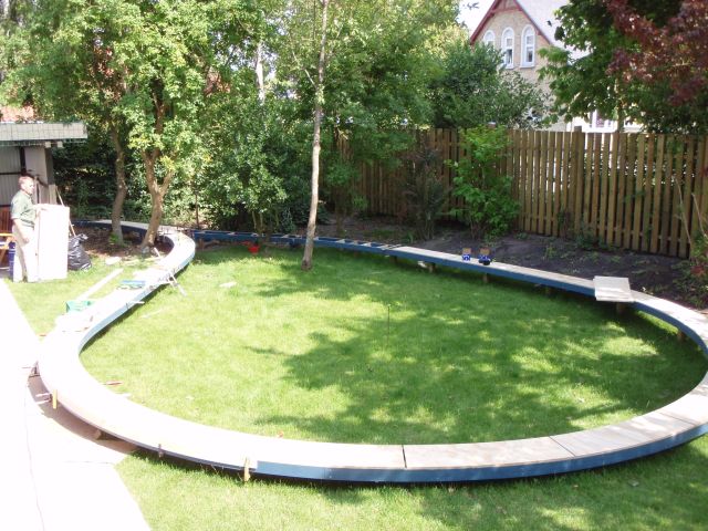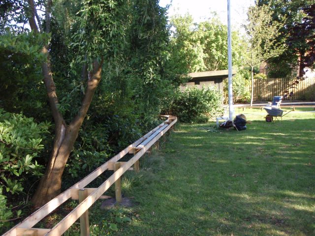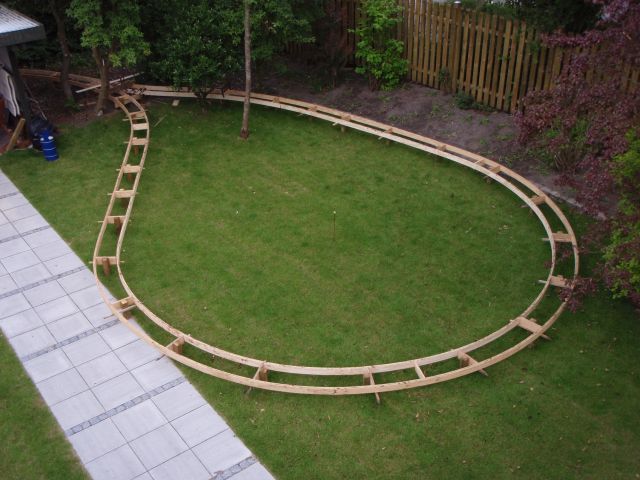 Yderste vange færdig! VI glæder os til at kunne sidde og se de små lokomotiver køre forbi. Samtidig med af den store vendesløjfe fremstilles arbejdes der på anlægget i resten af haven.