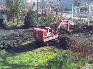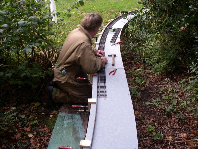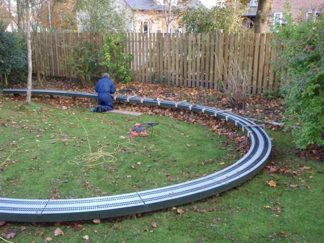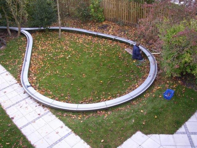 Her ses at der er tale om 2 dele. Den gamle rundbane (layout 1, ca 40 meter) og den nye tilføjelse (Layout 2, ca 160 m). I starten var det meningen at bibeholde Layout 1, og bygge denne sammen med det nye Layout 2, men konstruktionsdesignet for den nye del af havebanen var så meget bedre, at jeg besluttede helt at udskifte den gamle del af banen, så hele havebanen fremstod som en helhed. Selvom dette sidste tiltag gav en del ekstra arbejde har jeg ikke fortrudt. Anlægsarbejdet på begyndes Damptog skal helst kører på strækninger, hvor der ikke er stigninger eller fald. Da min grund skråner svagt mod nord var det nødvendigt at skrabe en del jord af i den sydlige ende, for at undgå at banen kom ned i jordhøjde. (Man skal jo kunne slå græs) Herunder ses en fotoserie af byggeprocessen.