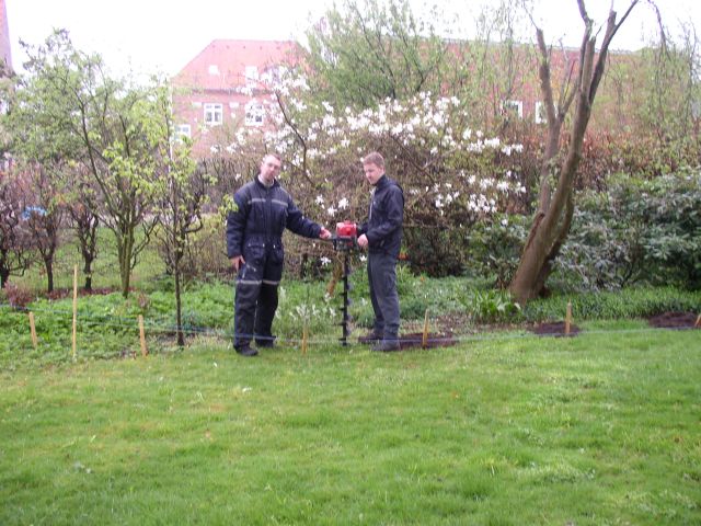 Boreteam igang. I første omgang blev der boret 90 huller i haven. Senere kom yderligere 30 til.