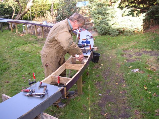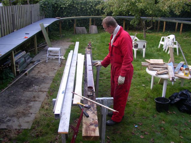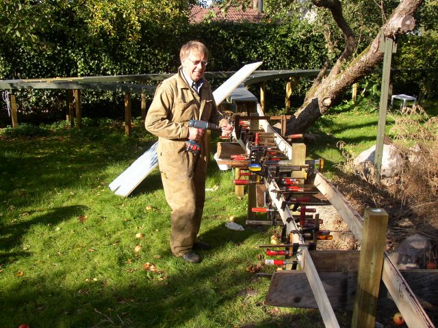 Her ses David igang med at give en af strimlerne lim. Vi har anvendt en "gammeldaws" syrehærdende lim. Det var den eneste der efter specifikationerne kunne holde til at være udendørs, og havde en passende lukketid. (medmindre vi havde valgt at anvende epoxy)