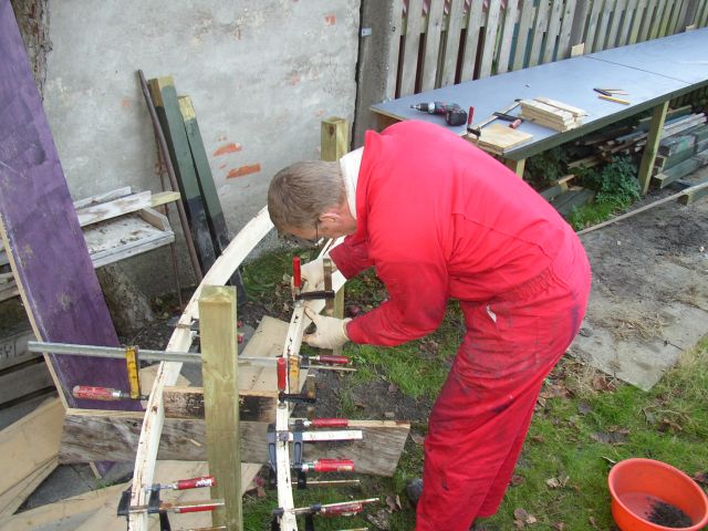 Vangerne i konstruktionen består af 3 stk 9mm krydsfiner, som limes sammen til en limtræsbjælke. De 2 limtræsbjælker er hver 9cm høje og spænder over ca. 120 cm mellem hver stolpe. De mange skruetvinger er nødvendige for at sikre en god limflade mellem de 3 lag. Da krydsfineren er 240 cm lang er de 3 strimler forskudt med 80 cm. Reelt betyder det at de 2 bjælker er sammenhængende over hele banen. Banen er altså én stor sammenhængende konstruktion. Dette sikre at den er usædvanlig stærk.