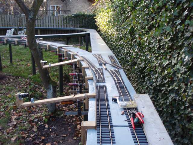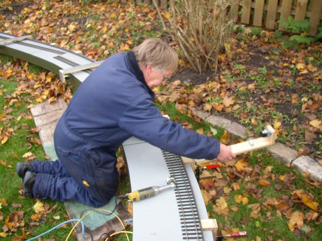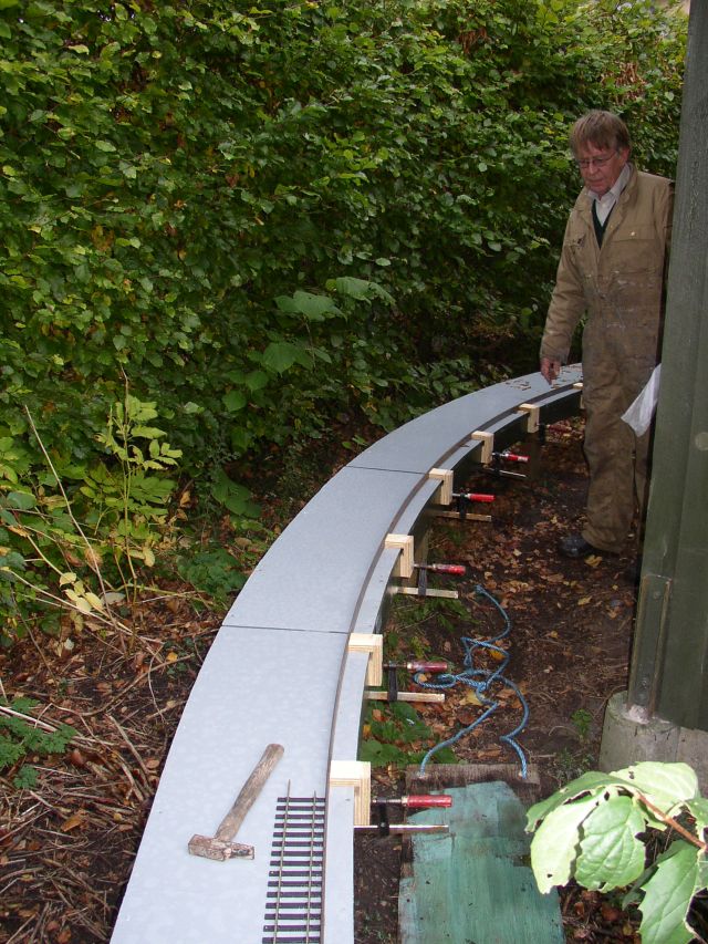 Vinkelklodserne fungerer som afstandsstykker, og er skruet ind i stålet. Som det ses får man en pæn kurve, og skinnenedlæggelsen er meget nemmere, når man har et "land" til at lægge op mod.