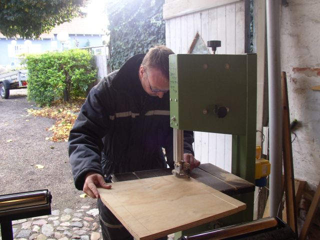 Her skæres den sidste dæksplade ud på båndsaven. Samtlige dæksplader er først tegnet op, og derefter skåret ud i hånden via båndsaven.