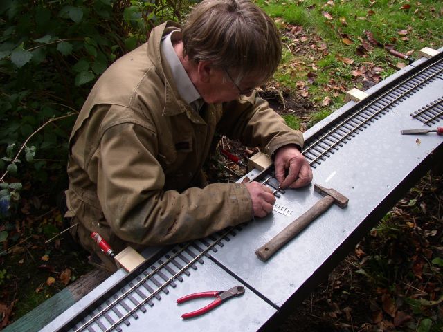 Her samles 2 sektioner med klemmer. Peco´s skinner er hver 90 cm lange, så der skal samles en del. Da skinner udvider sig - ligesom hos BaneDanmark :-) - er der indlagt en afstand på 1,2 mm mellem hver sektion.