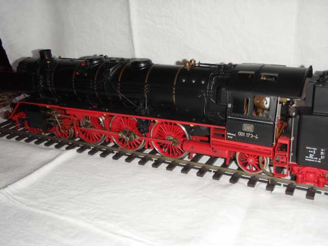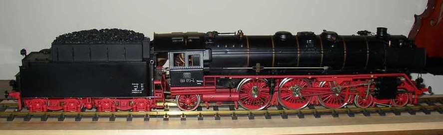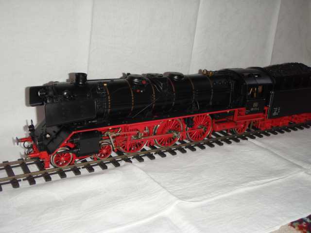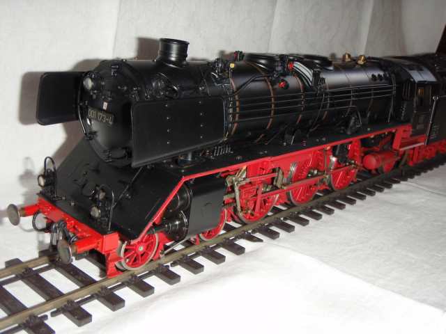 MASKINEN Klassisk maskine bygget af Aster i 1980. Den er næsten 80 cm lang, og virker ved første øjekast meget flot, og imponerende! Lidt af en "konge maskine" fordi den tager sig dødgodt ud. Virkelig en tilskuermagnet på banen. Historik 01 er angivelsen for at dette var den første standardiserede ekspreslokomotiv serie, som blev bygget til den tyske jernbane (Deutsche Reichsbahn blev ændret til Deutsche Bundesbahn i 1951). Inden Deutsche Reichsbahn blev oprettet i 1924, der havde været otte jernbaner i Tyskland (Preussen, Bayern, Sachsen, Wuerttenberg, Baden, Hessen, Mecklenburg og Oldenburg). Men de mange lokomotiver fra hvert jernbaneselskab havde ingen fælles specifikationer. Efter at de forskellige jernbaner var slået sammen, foretog de førende tyske lokomotivingeniører en undersøgelse, med det formål at finde en standardisering af de mange forskellige udgaver af 4-6-2 lokomotiver der fandtes. Resultatet var Br01 - Br er den tyske forkortelse for Baureihe (serie). 01 er altså føste klasse eller serie af ekspreslokomotiver. I alt 321 af de Br01-serien blev produceret mellem 1924 og 1938. Aster har valgt som sin prototype et eksempel på den mest populære lokomotivversion, 001 173-4 (tidligere 01 173) som er udstyret med Witte-type røgdeflektorer væk. Aster har sendt omkring 850 maskiner på markedet. En del færdigbygget andre som "saml selv byggesæt". Tekniske detailjer og kommentare Selv om DB Br 01 er en flot maskine er den på mange måder forældet idag. Kedlen er en primitiv Smithies, som kræver 4 væger for at kunne levere tryk nok. Mange af de nuværende maskiner er da også blevet ombygget indenfor de seneste år. Specielt er der flere, som har installeret ny kedel, superheater og en del har en dag ombygget den til gas. Får vi tid vil den være oplagt til et større kedelprojekt. Den er fra tiden før akselpumpe, men der findes nu et tysk fremstillet pumpesæt på markedet, dog venter vi på at Aster kommer ud med deres. Eller også bygges der noget hjemmefusk i kælderen, Herudover er det er den eneste maskine, som fra begyndelsen har været udstyret med en brænder med 4 væger. Rygtet siger at den ikke blev designet helt korrekt dengang i 1980, idet skorstenen og røgkammeret i store træk blev kopieret fra en Schools. Modsat mange andre maskiner var Fulgurex ikke med i designet af denne maskine. Den er tegnet og beregnet i Japan. Af særlige kendetegn er nok det rigtig fine hjulophæng. Alle hjul på lokomotivet har uafhængig affjedring - med langsgående bladfjedre fint samlet i en bue, med de største øverst. Min maskine er herudover lidt speciel, da det er en "Museums-udgave". dvs den har bremserør, elkabler + en mængde andre små fittings. Jeg er meget ambivalent hermed. På den ene side er de lækkert med en masse ekstra detailjer, på den anden side gør det den mere sårbar, og ikke mindst meget vanskeligere at vedligeholde/skille ad. Anyway, på trods af dens fejl er det en god maskine, som man ikke kan lade være med at synes om, . SPECIFIKATIONER FOR ASTER DB Br 01 Scala: 1.32, spor 1 (45 mm) Netto vægt: 6.1 kg (Lokomotiv 4.5 kg + Tender 1.6 kg)